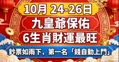 10月 24 26日,九皇爺保佑 6生肖財運最旺,鈔票如雨下,第一名「錢自動上門」